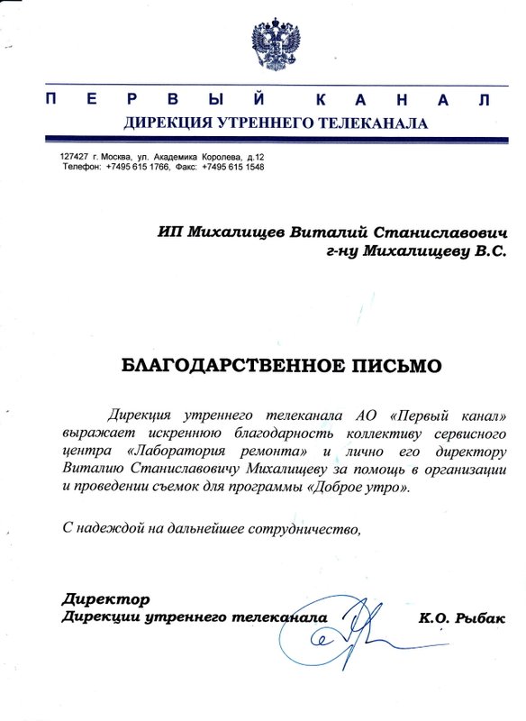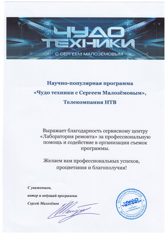 Большое спасибо за оперативный ремонт постоянно мне нужного прибора- парогенератора лаурастар. После диагностики сказали цену и срок ремонта. Подошло. Забрала, работает отлично.